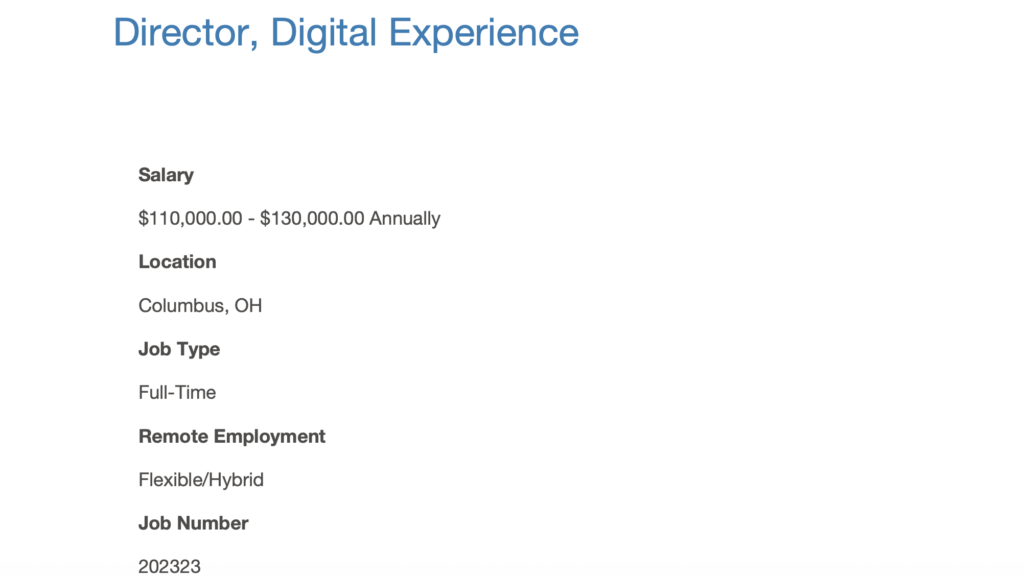 The posting describes an executive leadership position responsible for shaping and overseeing Hennepin County’s digital experience strategy, ensuring websites, online services, and digital tools are user-centered, accessible, and aligned with organizational priorities.