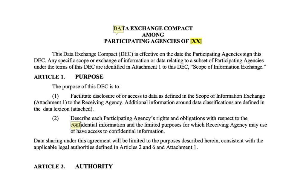 A comprehensive template for establishing legally compliant data-sharing agreements between government agencies, defining authorized purposes, privacy protections, security requirements, and governance responsibilities.