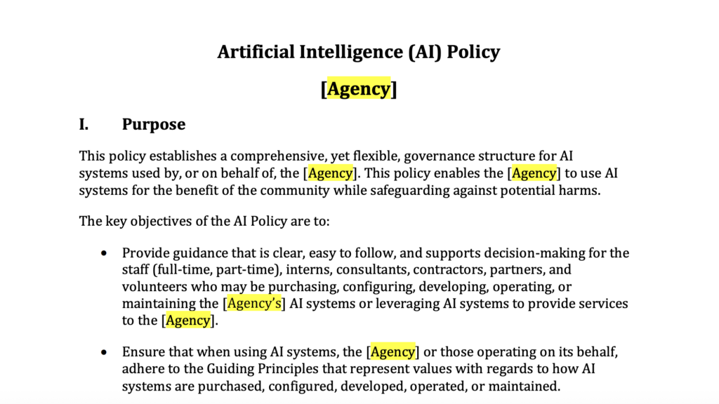 A customizable policy template that establishes governance, roles, principles, and risk-management processes for the responsible use of artificial intelligence within a government agency.
