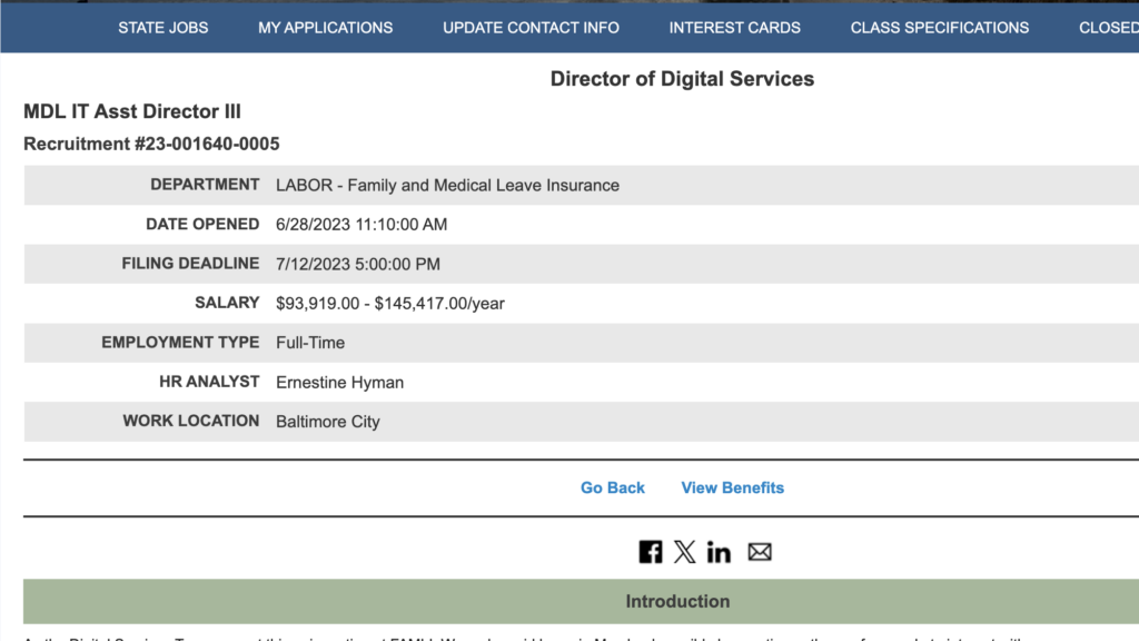 A public sector job posting for Maryland’s Director of Digital Services role, focused on building and leading user-centered digital systems for the state’s new paid family and medical leave program.